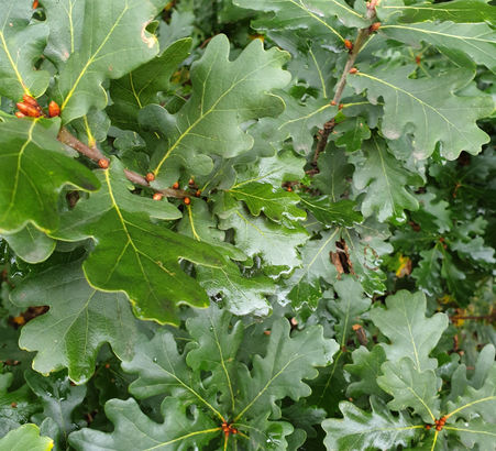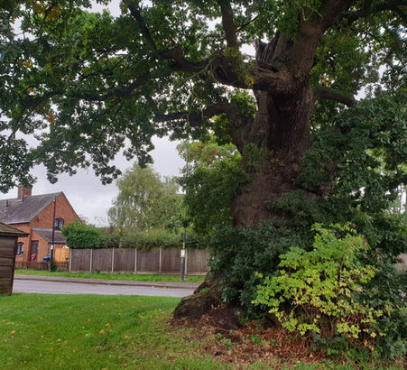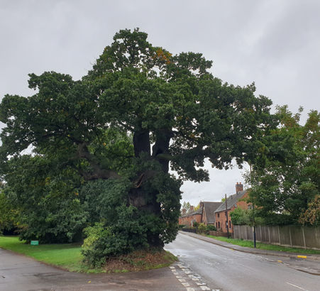mentioning "the old oak tree sitting at the apex of a triangular village green ... undoubtedly it is one of the finest oaks in the county, and its appearance is made more impressive by the rather isolated position in which it stands."